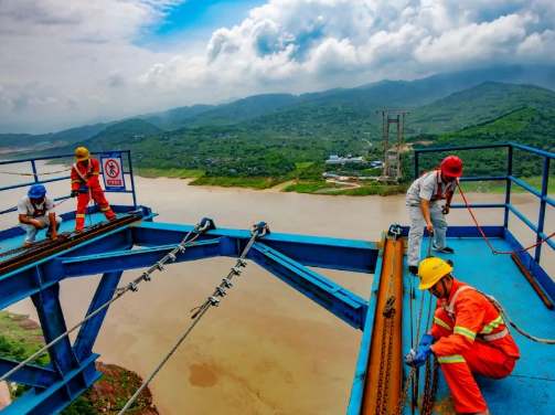 新田大橋建造時間緊、任務重,在確保質(zhì)量的前提下,施工人員在不斷的搶時間、趕進度。大橋建造過程中施工人員佩戴防墜器、安全帶、安全繩等個人保護裝備,攀爬到177米的主墩頂部安裝卷揚機,為牽引索安裝做準備。難度最大的要數(shù)鋼箱梁吊裝作業(yè),由于江流湍急、船舶定位難、臨江陡崖地帶復雜、長距離蕩移險等困難,項目建設團隊采用跨纜吊機+長吊索蕩移先進技術,配合手拉葫蘆、卸扣、起重滑車、卷揚機等工具,歷經(jīng)四個月順利完成鋼箱梁吊裝安裝作業(yè),為后期施工爭取寶貴的時間。